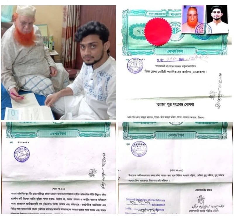 নেত্রকোনা জেলা ছাত্রলীগ নেতা মীর মো. জাহিদুর রহমান ছোটনকে আদালতে নোটারি করে ত্যাজ্যপুত্র করেছেন তার বাবা। বুধবার নিজের ফেসবুক আইডিতে নোটারির কপি দিয়ে এক আবেগঘন পোস্ট করেন। এর আগে মঙ্গলবার নেত্রকোনা আদালতের নোটারি পাবলিকেশন করে তার বাবা মীর আব্দুল খালেক তাকে ত্যাজ্যপুত্র করেন।