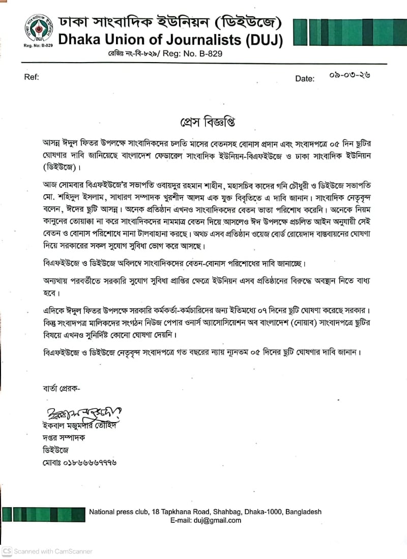 বিএফইউজে ও ডিইউজে অবিলম্বে সাংবাদিকদের বেতন-বোনাস পরিশোধের দাবি জানাচ্ছে।