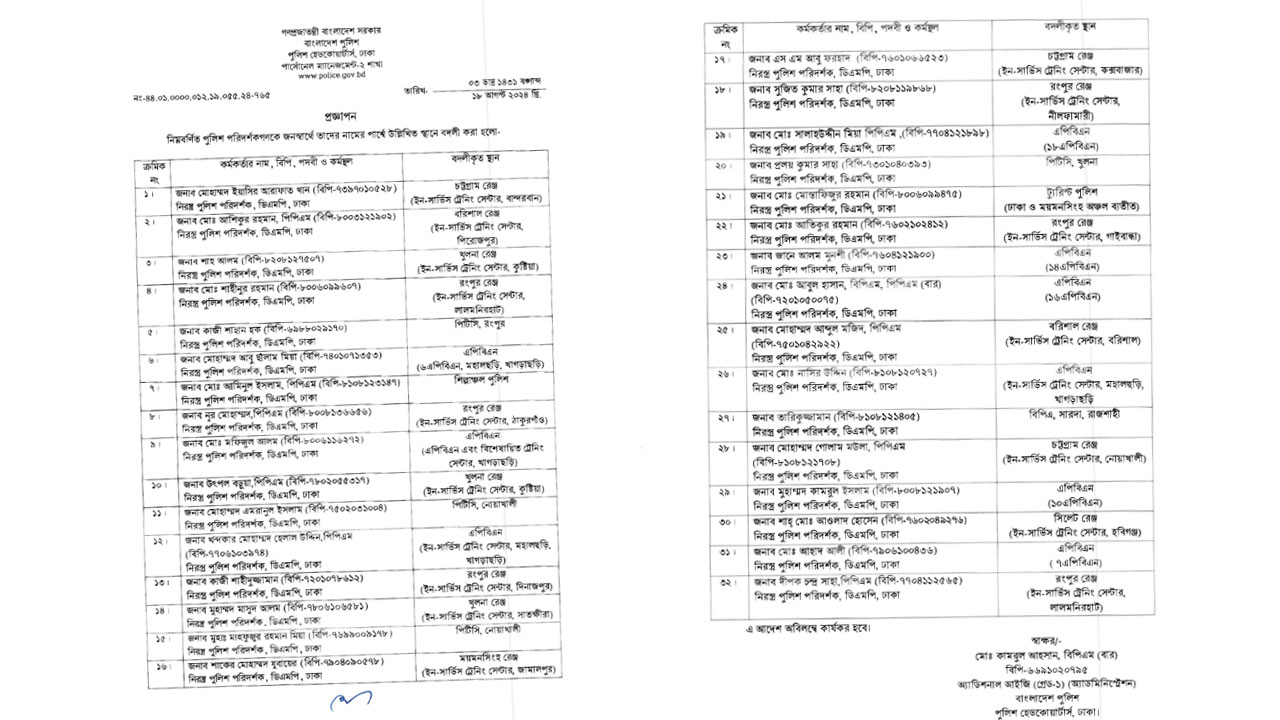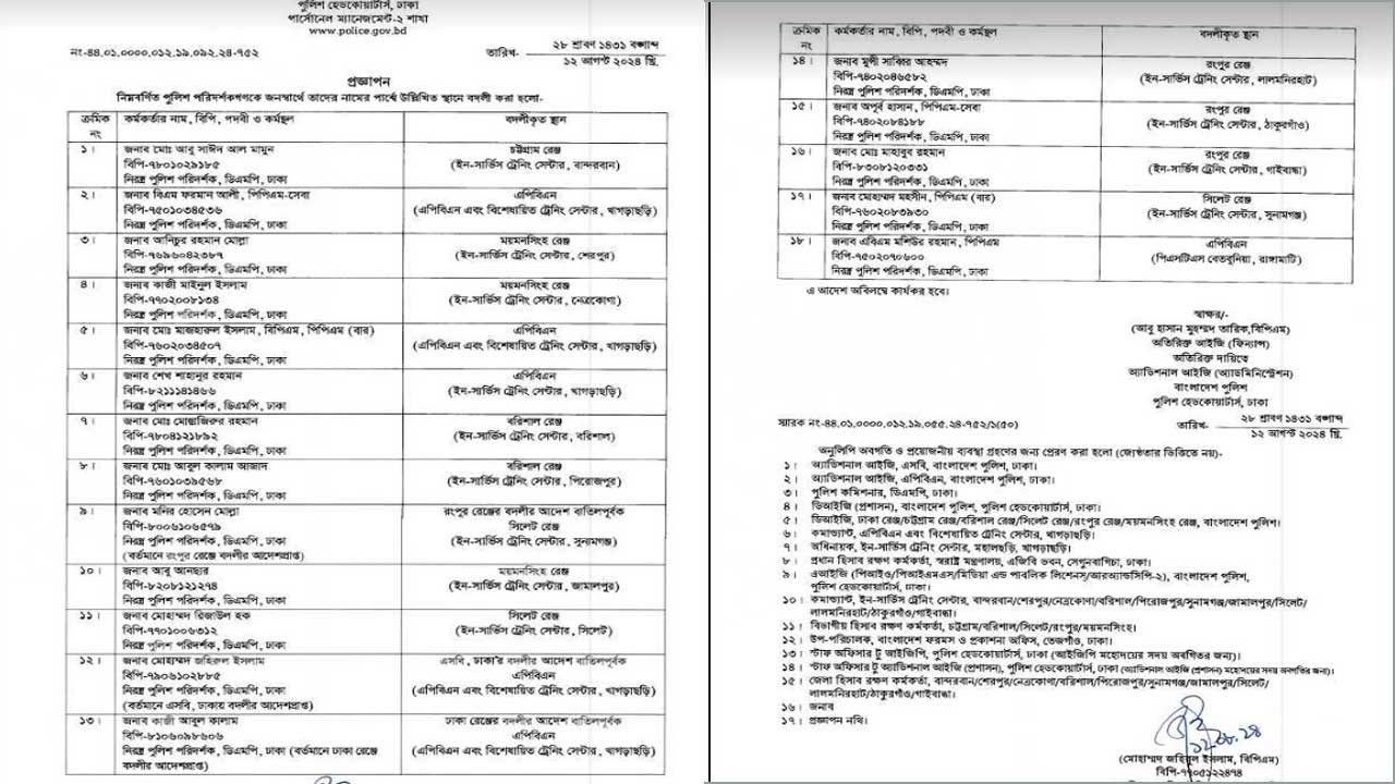 রবিবার (১৮আগস্ট) পুলিশ সদরদপ্তরের অতিরিক্ত ডিআইজি মোহাম্মদ জহিরুল ইসলাম সই করা প্রজ্ঞাপনে তাদের বদলি করা হয়।